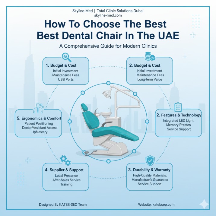 Selecting the best dental chair in the UAE involves balancing ergonomic design, durability, hygiene, and value. Prioritize chairs with adjustable seat heights (35–80 cm) and reclining backrests (0–90 degrees) to ensure optimal patient positioning and practitioner comfort.