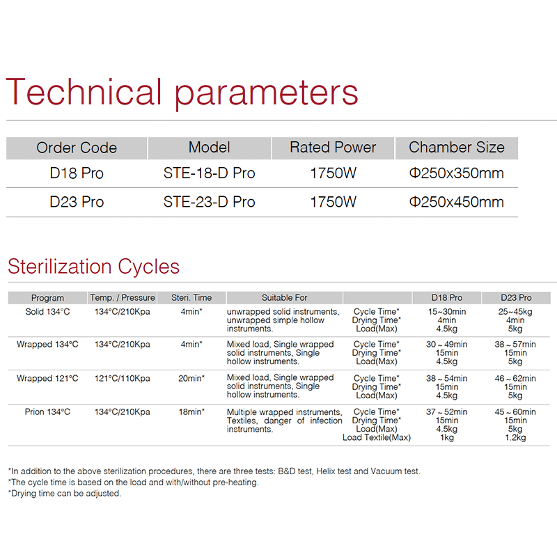 Built with a 2300W integrated steam generator, the D Pro series ensures rapid heating, reduced cycle times, and consistent sterilization performance that meets international clinical standards.
